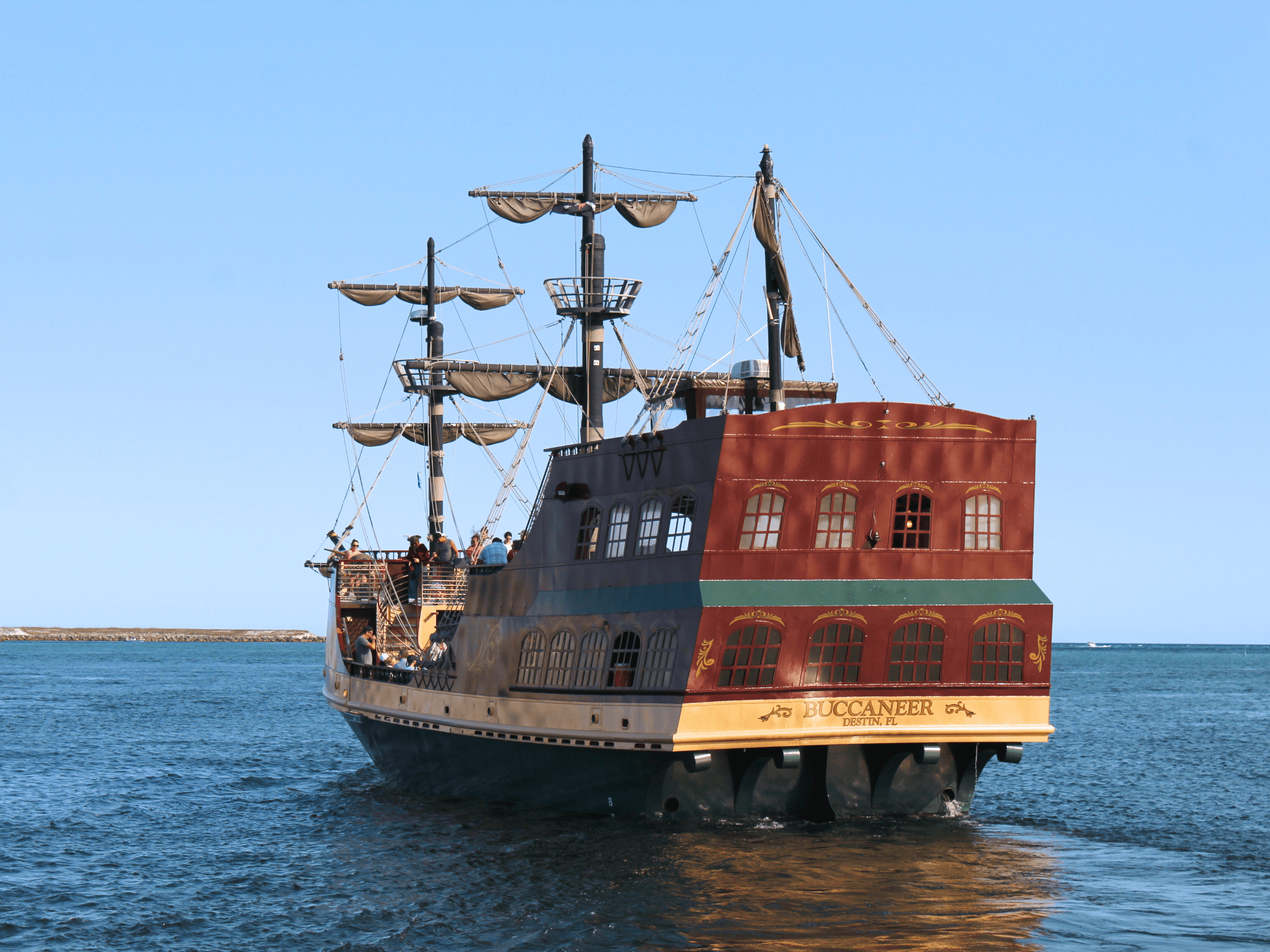 The Buccaneer is a 100-foot, triple deck vessel, U.S. Coast Guard approved for up to 149 passengers including any musicians, caterers, photographers, or special event personnel. The vessel is equipped with a galley, snack bar, restrooms, and a state-of-the-art sound system. Rates vary seasonally and include the boat, the captain, and the crew for a minimum of two hours.